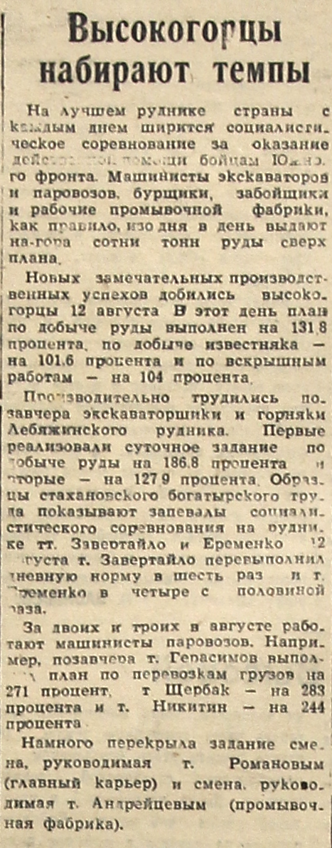 Новых замечательных производственных успехов добились высокогорцы 12 августа. В этот день план по добыче руды выполнен на 131,8 процента, по добыче известняка – на 101,6 процента и по вскрышным работам – на 104 процента. Производительно трудились позавчера экскаваторщики и горняки Лебяжинского рудника. Первые реализовали суточное задание по добыче руды на 186,8 процента и вторые – на 127,9 процента. Образцы стахановского богатырского труда показывают запевалы социалистического соревнования на руднике тт. Завертайло и Еременко. 12 августа т. Завертайло перевыполнил дневную норму в шесть раз и т. Еременко в четыре с половиной раза.