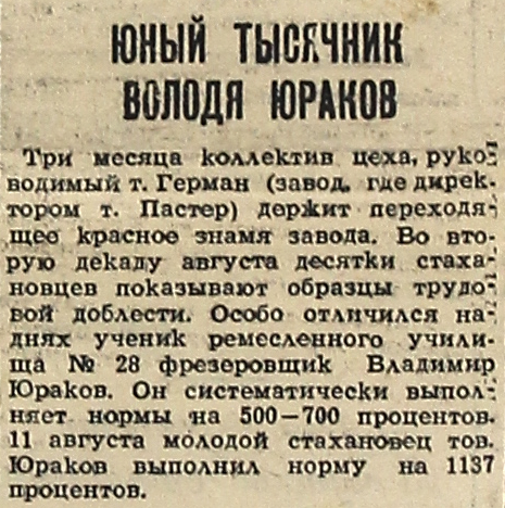Три месяца коллектив цеха, руководимый т. Герман (завод, где директором т. Пастер) держит переходящее красное знамя завода. Во вторую декаду августа десятки стахановцев показывают образцы трудовой доблести. Особо отличился на-днях ученик ремесленного училища № 28 фрезеровщик Владимир Юраков. Он систематически выполняет нормы на 500-700 процентов. 11 августа молодой стахановец тов. Юраков выполнил норму на 1137 процентов.