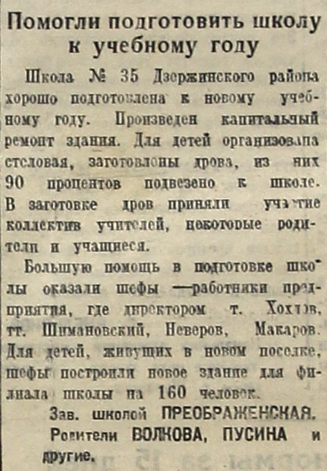 Большую помощь в подготовке школы оказали шефы – работники предприятия, где директором т. Хохлов, тт. Шимановский, Неверов, Макаров. Для детей, живущих в новом поселке, шефы построили новое здание для филиала школы на 160 человек.