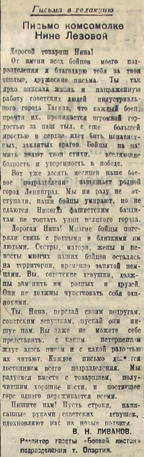 От имени всех бойцов моего подразделения я благодарю тебя за твои теплые, дружеские письма. Ты так ярко описала жизнь и напряженную работу советских людей индустриального города Тагила, что каждый боец, прочтя их, проникается огромной гордостью за наш тыл, с еще большей яростью в сердце идет бить ненавистных, заклятых врагов. Бойцы на память знают твои стихи, вселяющие бодрость и уверенность в победе.
