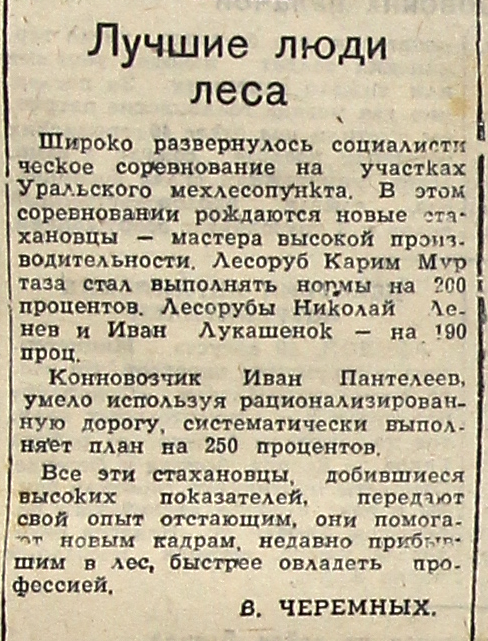 Широко развернулось социалистическое соревнование на участках Уральского мехлесопункта. В этом соревновании рождаются новые стахановцы – мастера высокой производительности. Лесоруб Карим Mуpтаза стал выполнять нормы на 200 процентов. Лесорубы Николай Ленев и Иван Лукашенок – на 190 проц.