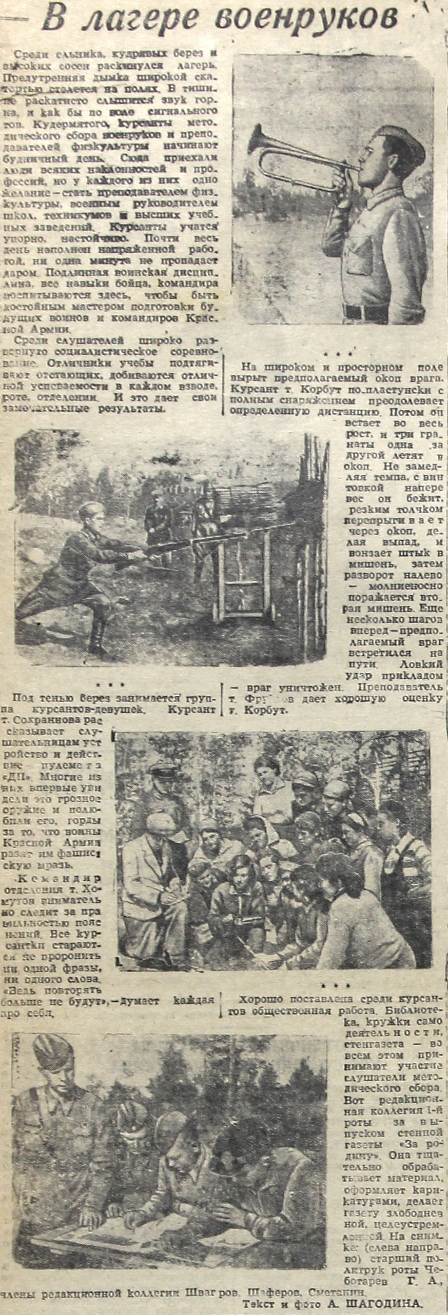 Среди ельника, кудрявых берез и высоких сосен раскинулся лагерь. Предутренняя дымка широкой скатертью стелется на полях. В тишине раскатисто слышится звук горна, и как бы по воле сигнального тoв. Кудермятого курсанты методического сбора военруков и преподавателей физкультуры начинают будничный день. Сюда приехали люди всяких наклонностей и профессий, но у каждого из них одно желание – стать преподавателем физкультуры, военным руководителем школ, техникумов, высших учебных заведений. Курсанты учатся упорно, настойчиво. Почти весь день наполнен напряженной работой, ни одна минута не пропадает даром. Подлинная воинская дисциплина, все навыки бойца, командира воспитываются здесь, чтобы быть достойным мастером подготовки будущих воинов и командиров Красной Армии.