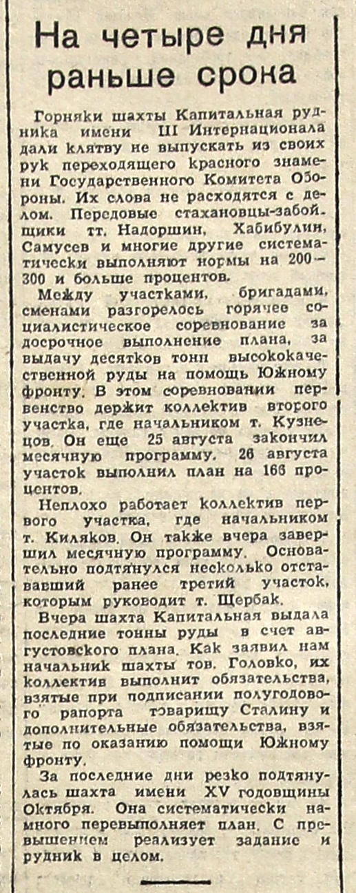 Горняки шахты Капитальная рудника имени III Интернационала дали клятву не выпускать из своих рук переходящего красного знамени Государственного Комитета Обороны. Их слова не расходятся с делом. Передовые стахановцы-забойщики тт. Надоршин, Хабибулин, Самусев и многие другие систематически выполняют нормы на 200-300 и больше процентов.