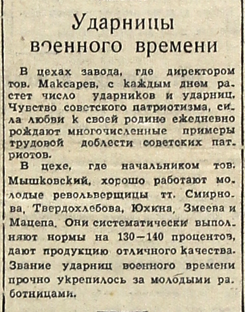 В цехе, где начальником тов. Мышковский, хорошо работают молодые револьверщицы тт. Смирнова, Твердохлебова, Южина, Змеева и Мацепа. Они систематически выполняют нормы на 130-140 процентов, дают продукцию отличного качества. Звание ударниц военного времени прочно укрепилось за молодыми работницами.