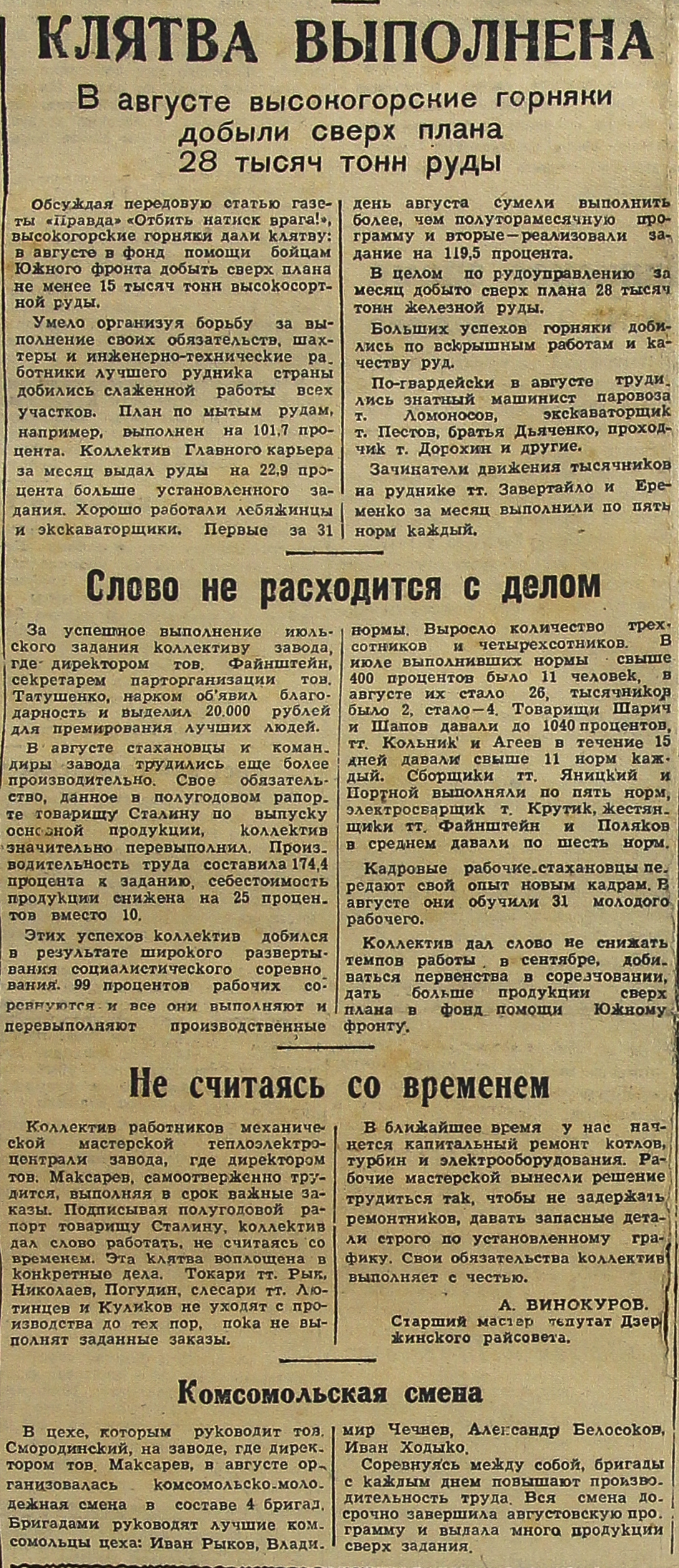 Коллектив работников механической мастерской теплоэлектроцентрали завода, где директором тов. Максарев, самоотверженно трудится, выполняя в срок важные заказы. Подписывая полугодовой рапорт товарищу Сталину, коллектив дал слово работать, не считаясь со временем. Эта клятва воплощена в конкретные дела. Токари тт. Рык, Николаев, Погудин, слесари тт. Лютинцев и Куликов не уходят с производства до тех пор, пока не выполнят заданные заказы.