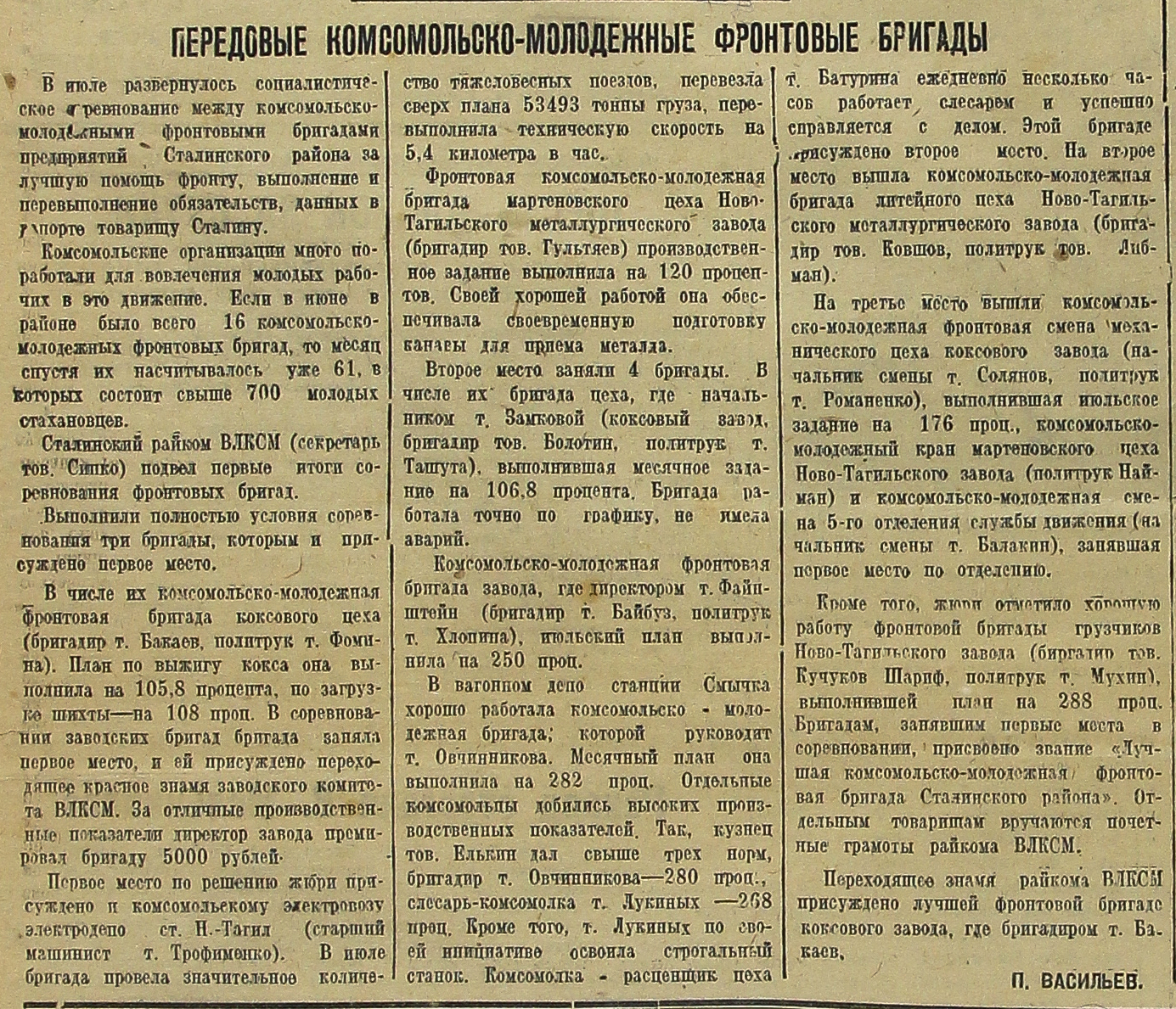 В числе их комсомольско-молодежная фронтовая бригада коксового цеха (бригадир т. Бакаев, политрук т. Фомина). План по выжигу кокса она выполнила на 105,8 процента, по загрузке шихты – на 108 проц. В соревновании заводских бригад бригада заняла первое место, и ей присуждено переходящее красное знамя заводского комитета ВЛКСМ. За отличные производственные показатели директор завода премировал бригаду 5000 рублей.