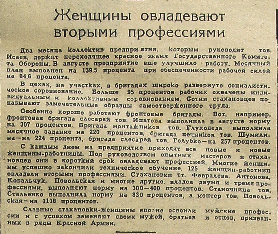 С каждым днем на предприятие приходят все новые и новые женщины-работницы. Под руководством опытных мастеров и стахановцев они в короткий срок овладевают профессией. Многие женщины успешно закончили техническое обучение. 125 женщин-работниц овладели вторыми профессиями. Стахановки тт. Февралева, Антонова, Ковальчук, Повольская и многие другие, владея двумя и тремя профессиями, выполняют норму на 300 – 400 процентов. Станочница тов. Стальенко выполнила норму на 830 процентов, а монтер тов. Повольская – на 1118 процентов.