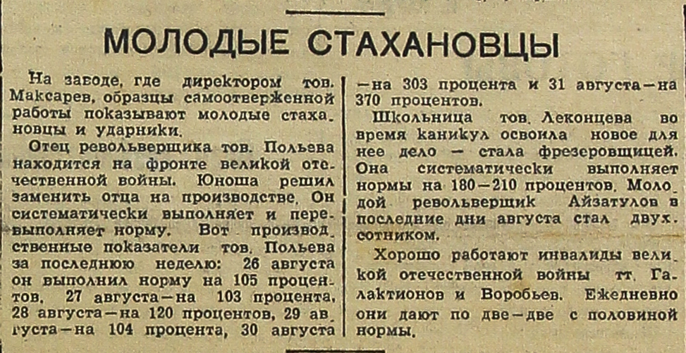 Отец револьверщика тов. Польева находится на фронте великой отечественной войны. Юноша решил заменить отца на производстве. Он систематически выполняет и перевыполняет норму. Вот производственные показатели тов. Польева за последнюю неделю: 26 августа он выполнил норму на 105 процентов, 27 августа – на 103 процента, 28 августа – на 120 процентов, 29 августа – на 104 процента, 30 августа – на 303 процента и 31 августа – на 370 процентов.