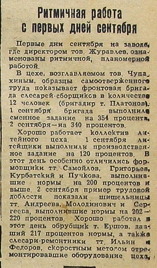 Хорошо работает коллектив литейного цеха. 1 сентября литейщики выполнили производственное задание на 120 процентов. В этот день особенно отличились формовщики тт. Самойлов, Григорьев, Курбатский и Пучкова, выполнившие нормы на 200 процентов и выше. 2 сентября пример трудовой доблести показали шишельницы тт. Андреева, Молодинович и Сергеева, выполнившие нормы на 202 – 220 процентов. Хорошо работал в этот день обрубщик т. Ершов, давший 217 процентов нормы, а также слесари-ремонтники тт. Ильин и Федоров, скоростным методом отремонтировавшие оборудование цеха.