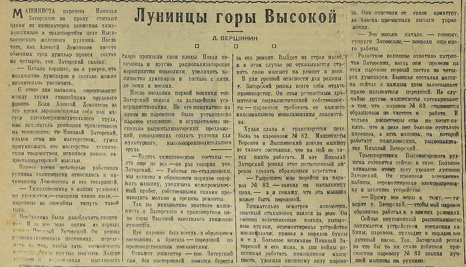 Так по инициативе знатного машиниста т. Заторского в транспортном цехе горы Высокой зародилось движение лунинцев.