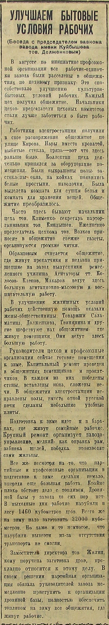 Все же несмотря на то, что партийные и профсоюзные организации в подготовке к зиме сделали немало, впереди еще большая работа. Крайне плохо обстоит дело с топливом. Дровяной базы у завода до сих пор нет. В выходные дни рабочие нарубили в лесу 1460 кубометров дров. Всего же на зиму надо заготовить 22000 кубометров. Но даже и то немногое, что нарубили, вывезти из-за отсутствия транспорта не смогли.