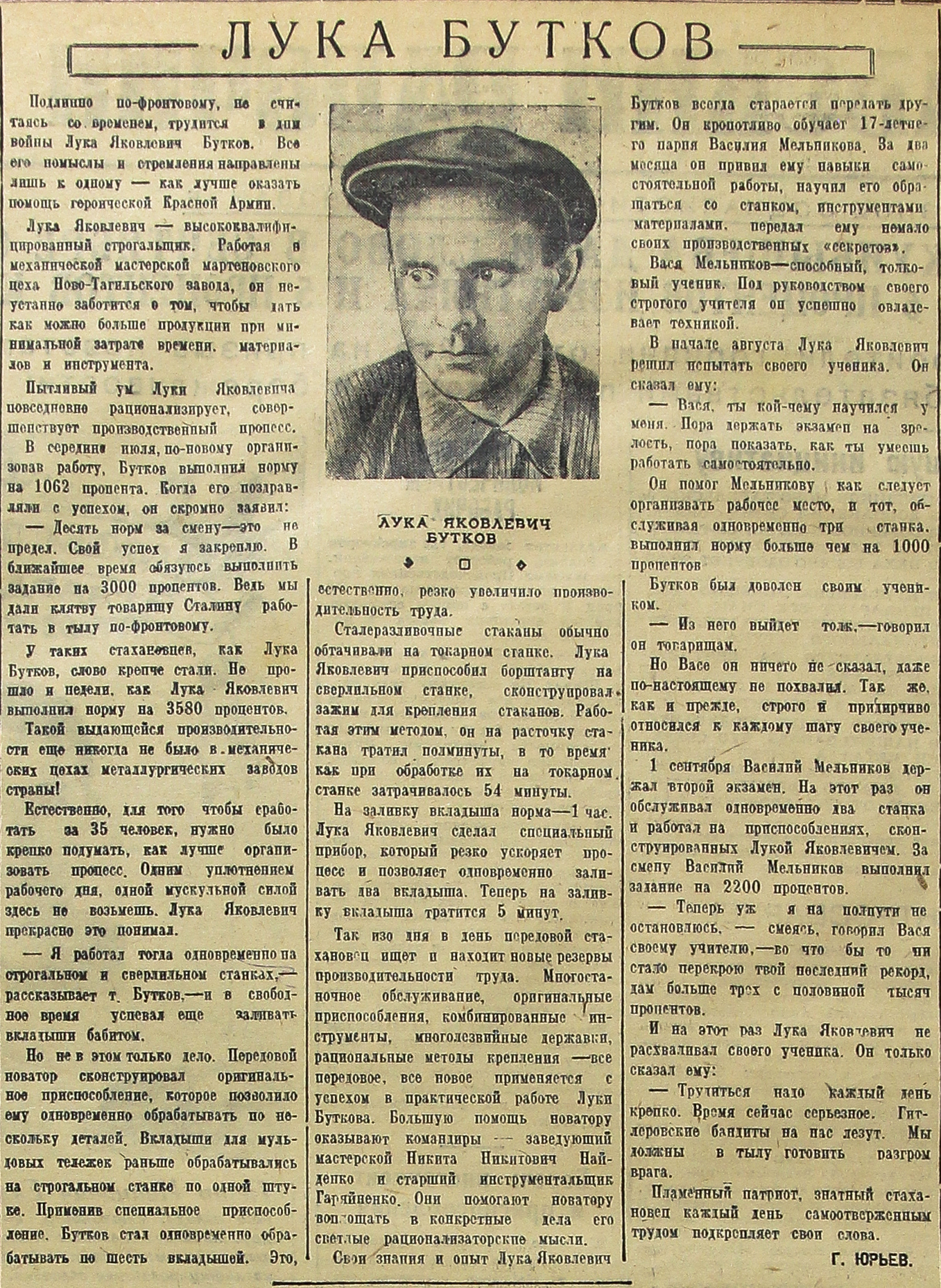 Подлинно по-фронтовому, не считаясь со временем, трудится в дни войны Лука Яковлевич Бутков. Все его помыслы и стремления направлены лишь к одному – как лучше оказать помощь героической Красной Армии.