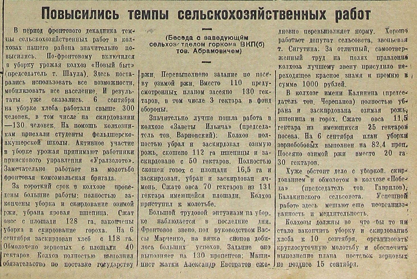 В период фронтового декадника темпы сельскохозяйственных работ в колхозах нашего района значительно повысились. По-фронтовому включился в уборку урожая колхоз «Новый быт» (председатель т. Шаула). Здесь постарались использовать все возможности, мобилизовать все население. И результаты уже сказалась. 6 сентября на уборке хлеба работали свыше 300 человек, в том числе на скирдовании – 130 человек. На помощь колхозникам приехали студенты фельдшерско-акушерской школы. Активное участие в уборке урожая принимают работники приискового управления «Уралзолото». Замечательно работает на молотьбе фронтовая комсомольская бригада.