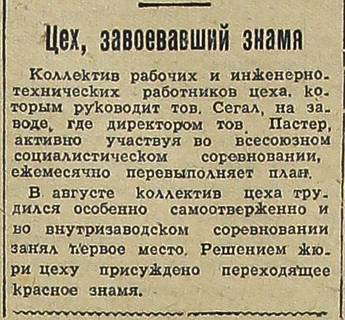 Коллектив рабочих и инженерно-технических работников цеха, которым руководит тов. Сегал, на заводе, где директором тов. Пастер, активно участвуя во всесоюзном социалистическом соревновании, ежемесячно перевыполняет план.