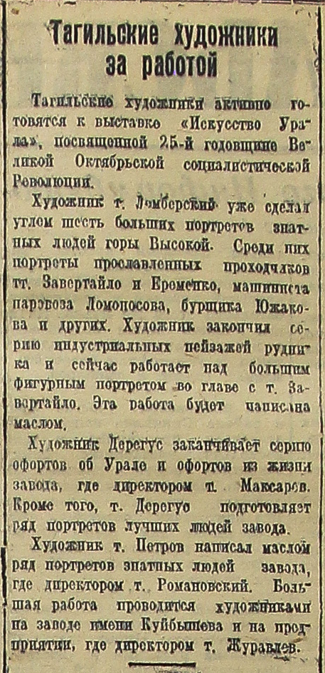 Тагильские художники активно готовятся к выставке «Искусство Урала», посвященной 25-й годовщине Великой Октябрьской социалистической Революции.