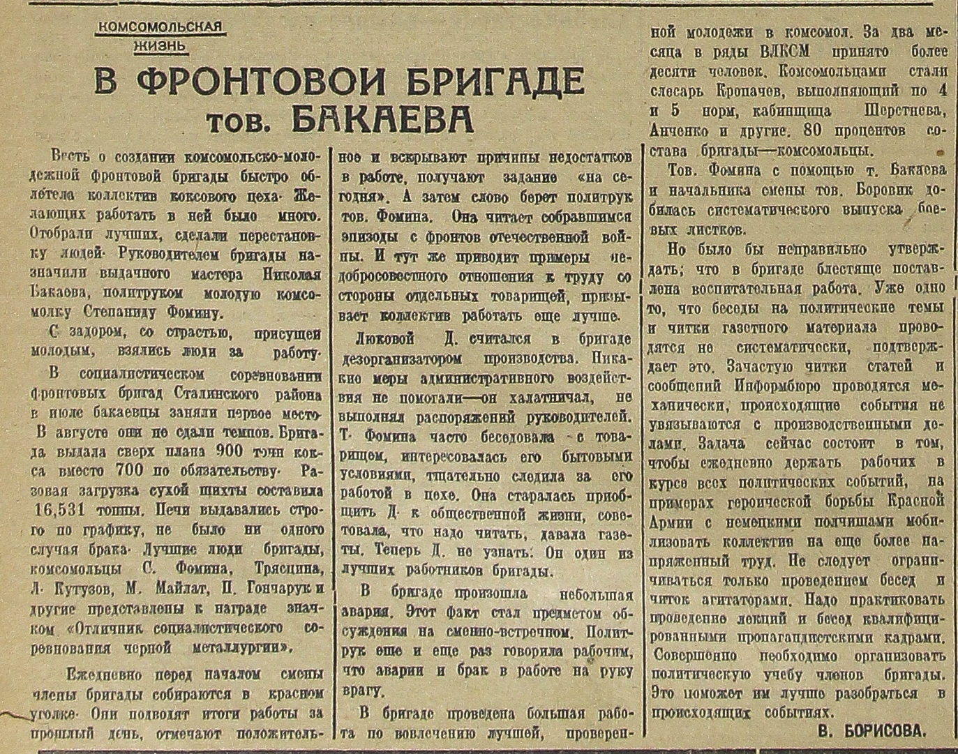 В социалистическом соревновании фронтовых бригад Сталинского района в июле бакаевцы заняли первое место. В августе они не сдали темпов. Бригада выдала сверх плана 900 тонн кокса вместо 700 по обязательству. Разовая загрузка сухой шихты составила 16,531 тонны. Печи выдавались строго по графику, не было ни одного случая брака. Лучшие люди бригады, комсомольцы С. Фомина, Трясцина, Л. Кутузов, М. Майлат, П. Гончарук и другие представлены к награде значком «Отличник социалистического соревнования черной металлургии».