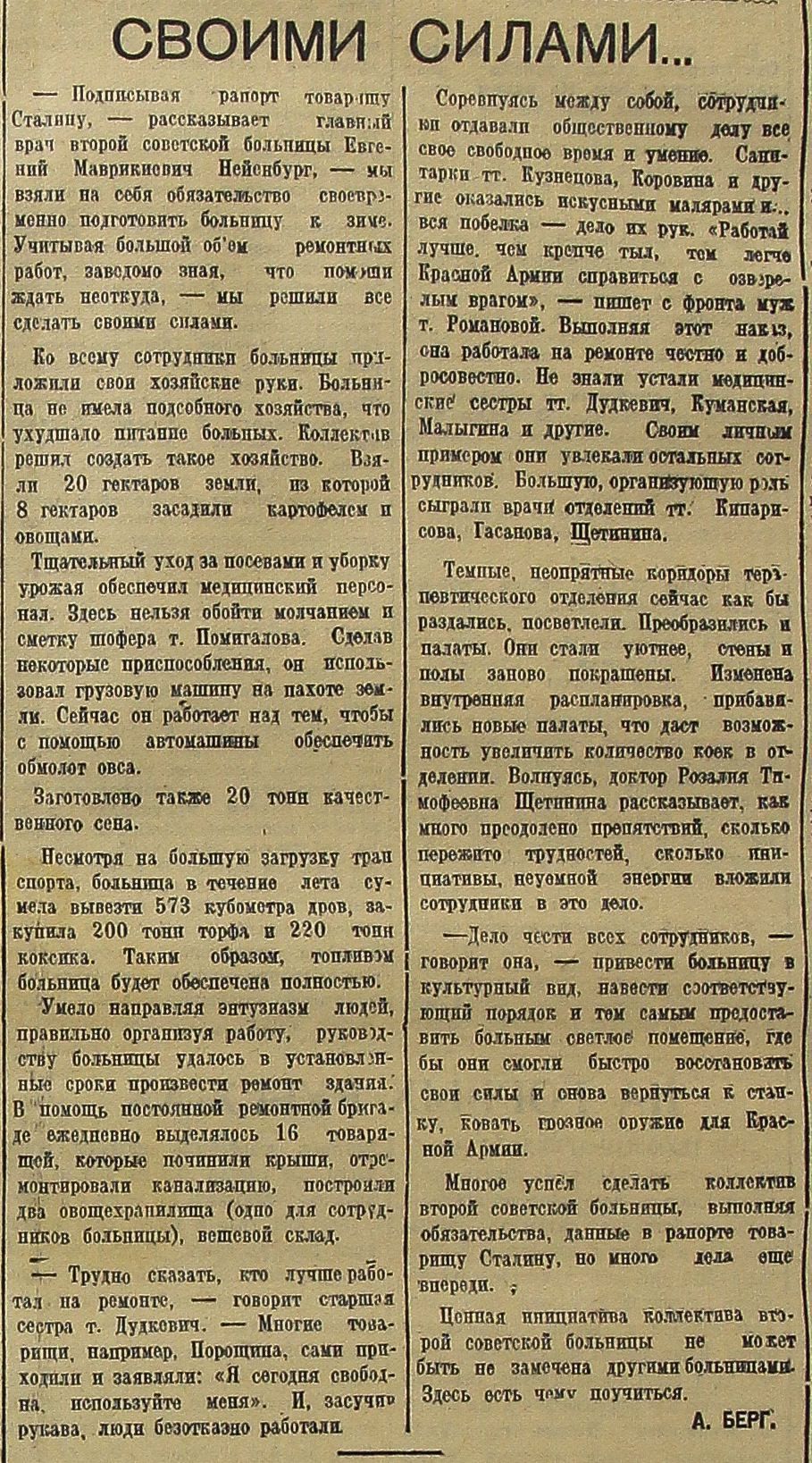 – Подписывая рапорт товарищу Сталину, – рассказывает главный врач второй советской больницы Евгений Маврикиевич Нейенбург, – мы взяли на себя обязательство своевременно подготовить больницу к зиме. Учитывая большой объем ремонтных работ, заведомо зная, что помощи ждать неоткуда, – мы решили все сделать своими силами.