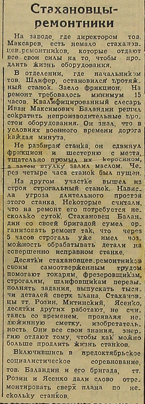 Десятки стахановцев-ремонтников своим самоотверженным трудом помогают токарям, фрезеровщикам, строгалям, шлифовщикам перевыполнять задания, выпускать тысячи деталей сверх плана. Стахановцы тт. Розин, Митинский, Ясенко, десятки других работают, не считаясь со временем, проявляя недюжинную сметку, изобретательность. Они все свои знания, энергию отдают тому, чтобы как можно больше продлить жизнь станков.