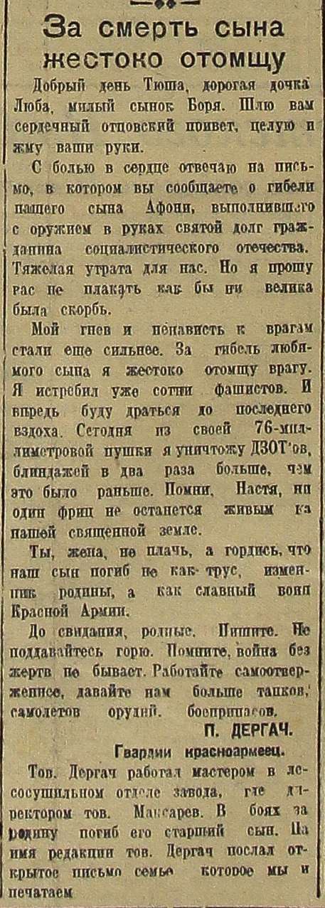 Тов. Дергач работал мастером в лесосушильном отделе завода, где директором тов. Макаров. В боях за родину погиб его старший сын. На имя редакции тов. Дергач послал открытое письмо семье которое мы и печатаем.
