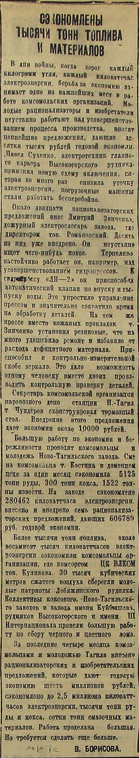 За последние четыре месяца комсомольцами и молодежью Тагила внесено рационализаторских и изобретательских предложений, которые дают годовую экономию шесть миллионов рублей, сэкономлено до 2,5 миллиона киловаттчасов электроэнергии, тысячи тонн руды и кокса, сотни тонн смазочных материалов. Работа проделана большая. Но требуется сделать еще больше.