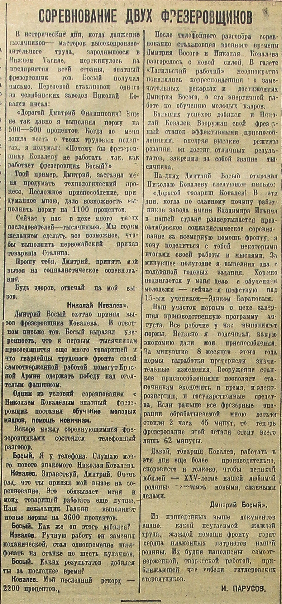 В исторические дни, когда движение тысячников – мастеров высокопроизводительного труда, зародившееся в Нижнем Тагиле, перекинулось на предприятия всей страны, знатный фрезеровщик тов. Босый получил письмо. Передовой стахановец одного из челябинских заводов Николай Ковалев писал: