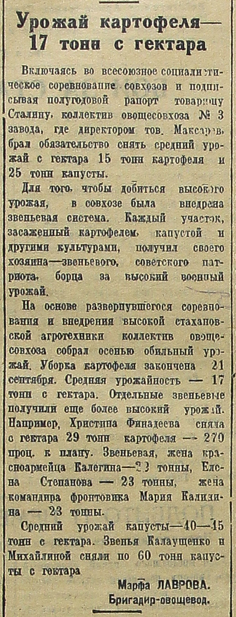 На основе развернувшегося соревнования и внедрения высокой стахановской агротехники коллектив овощесовхоза собрал осенью обильный урожай. Уборка картофеля закончена 21 сентября. Средняя урожайность – 17 тонн с гектара. Отдельные звеньевые получили еще более высокий урожай. Например, Христина Финадеева сняла с гектара 29 тонн картофеля – 270 проц. к плану. Звеньевая, жена красноармейца Калегина – 23 тонны, Елена Степанова – 23 тонны, жена командира фронтовика Мария Калинина – 23 тонны.