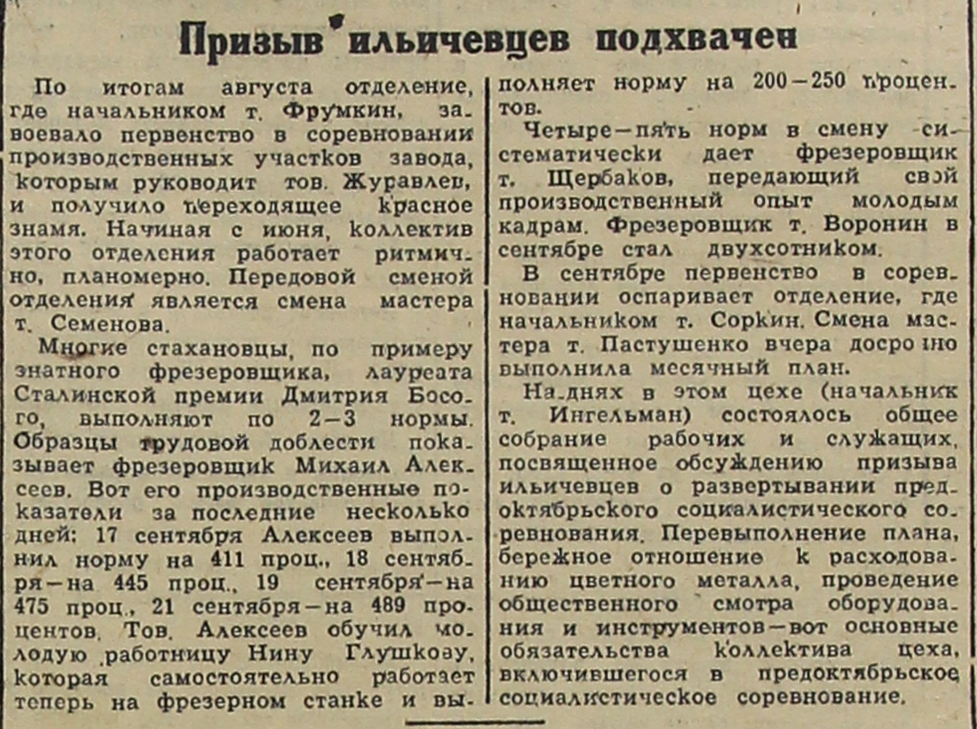 Многие стахановцы, по примеру знатного фрезеровщика, лауреата Сталинской премии Дмитрия Босого, выполняют по 2-3 нормы. Образцы трудовой доблести показывает фрезеровщик Михаил Алексеев. Вот его производственные показатели за последние несколько дней: 17 сентября Алексеев выполнил норму на 411 проц., 18 сентября – на 445 проц., 19 сентября – на 475 проц., 21 сентября – на 489 процентов. Тов. Алексеев обучил молодую работницу Нину Глушкову, которая самостоятельно работает теперь на фрезерном станке и выполняет норму на 200-250 процентов.