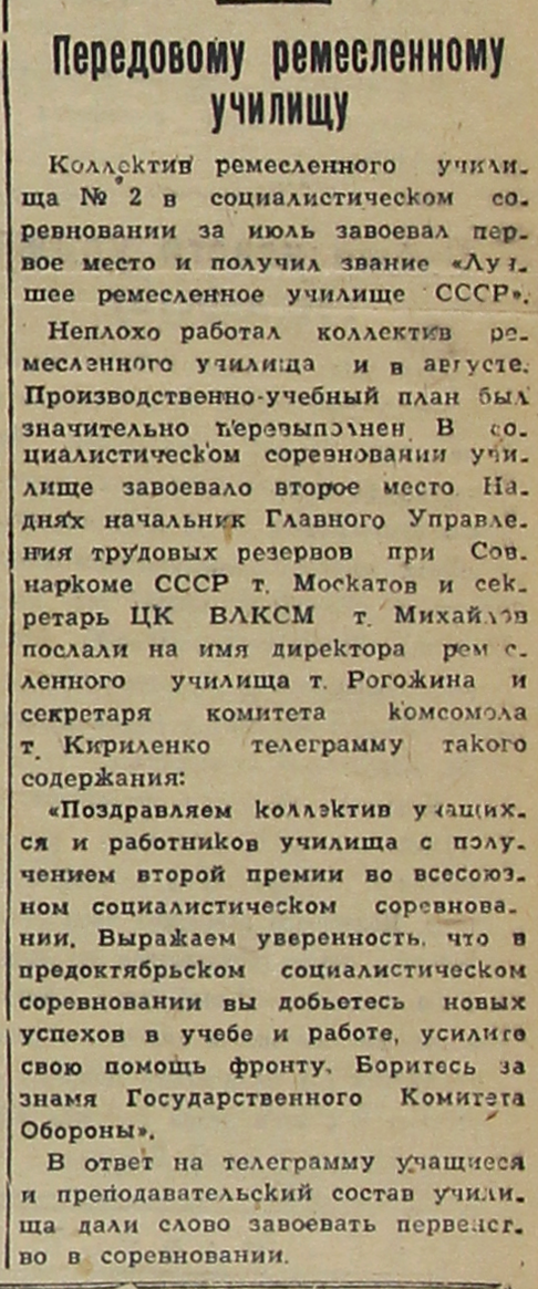 Неплохо работал коллектив ремесленного училища и в августе. Производственно-учебный план был значительно перевыполнен. В социалистическом соревновании училище завоевало второе место. На-днях начальник Главного Управления трудовых резервов при Совнаркоме СССР т. Москатов и секретарь ЦК ВЛКСМ т. Михайлов послали на имя директора ремесленного училища т. Рогожина и секретаря комитета комсомола т. Кириленко телеграмму такого содержания: