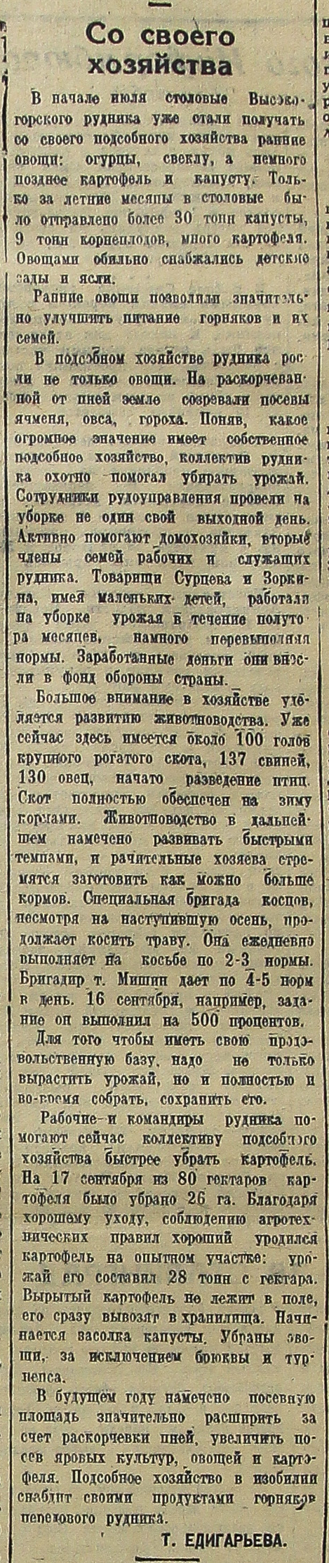 В подсобном хозяйстве рудника росли не только овощи. На раскорчеванной от пней земле созревали посевы ячменя, овса, гороха. Поняв, какое огромное значение имеет собственное подсобное хозяйство, коллектив рудника охотно помогал убирать урожай. Сотрудники рудоуправления провели на уборке не один свой выходной день. Активно помогают домохозяйки, вторые члены семей рабочих и служащих рудника. Товарищи Сурцева и Зоркина, имея маленьких детей, работали на уборке урожая в течение полутора месяцев, намного перевыполняя нормы. Заработанные деньги они внесли в фонд обороны страны.