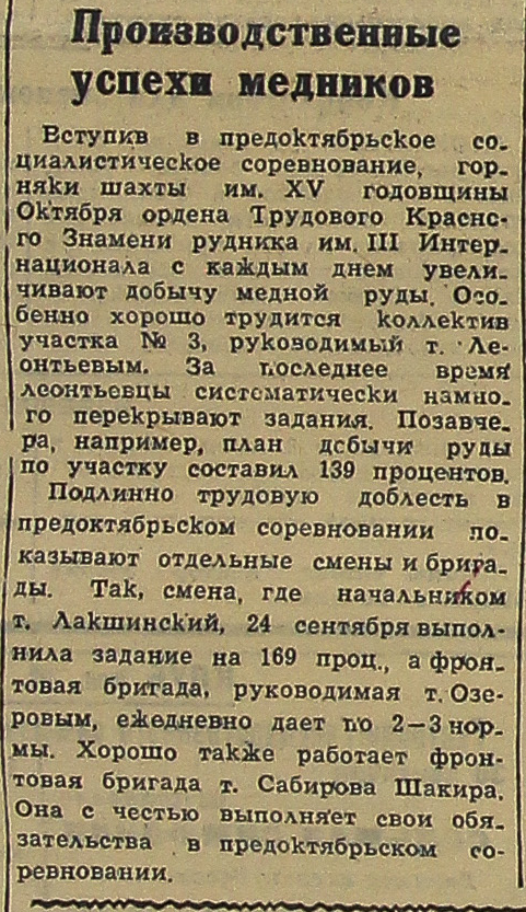 Вступив в предоктябрьское социалистическое соревнование, горняки шахты им. XV годовщины Октября ордена Трудового Красного Знамени рудника им. III Интернационала с каждым днем увеличивают добычу медной руды. Особенно хорошо трудится коллектив участка № 3, руководимый т. Леонтьевым. За последнее время леонтьевцы систематически намного перекрывают задания. Позавчера, например, план добычи руды по участку составил 139 процентов.
