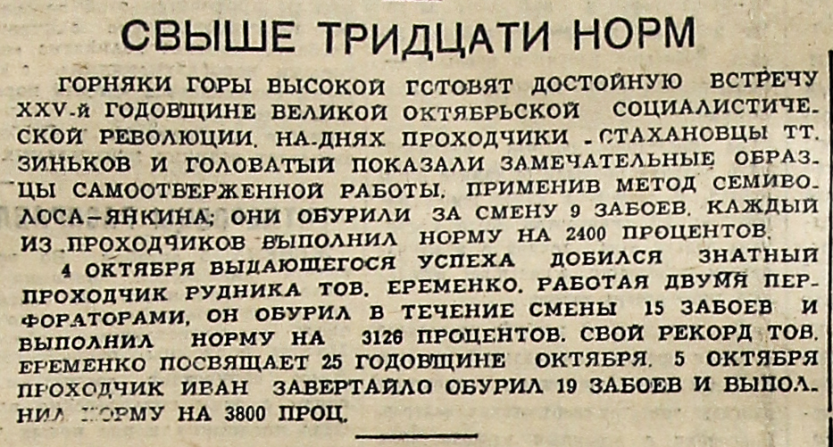 Горняки горы Высокой готовят достойную встречу XXV-й годовщине Великой Октябрьской социалистической революции. На днях проходчики – стахановцы тт. Зиньков и Головатый показали замечательные образцы самоотверженной работы, применив метод Семиволоса-Янкина; они обурили за смену 9 забоев. Каждый из проходчиков выполнил норму на 2400 процентов.