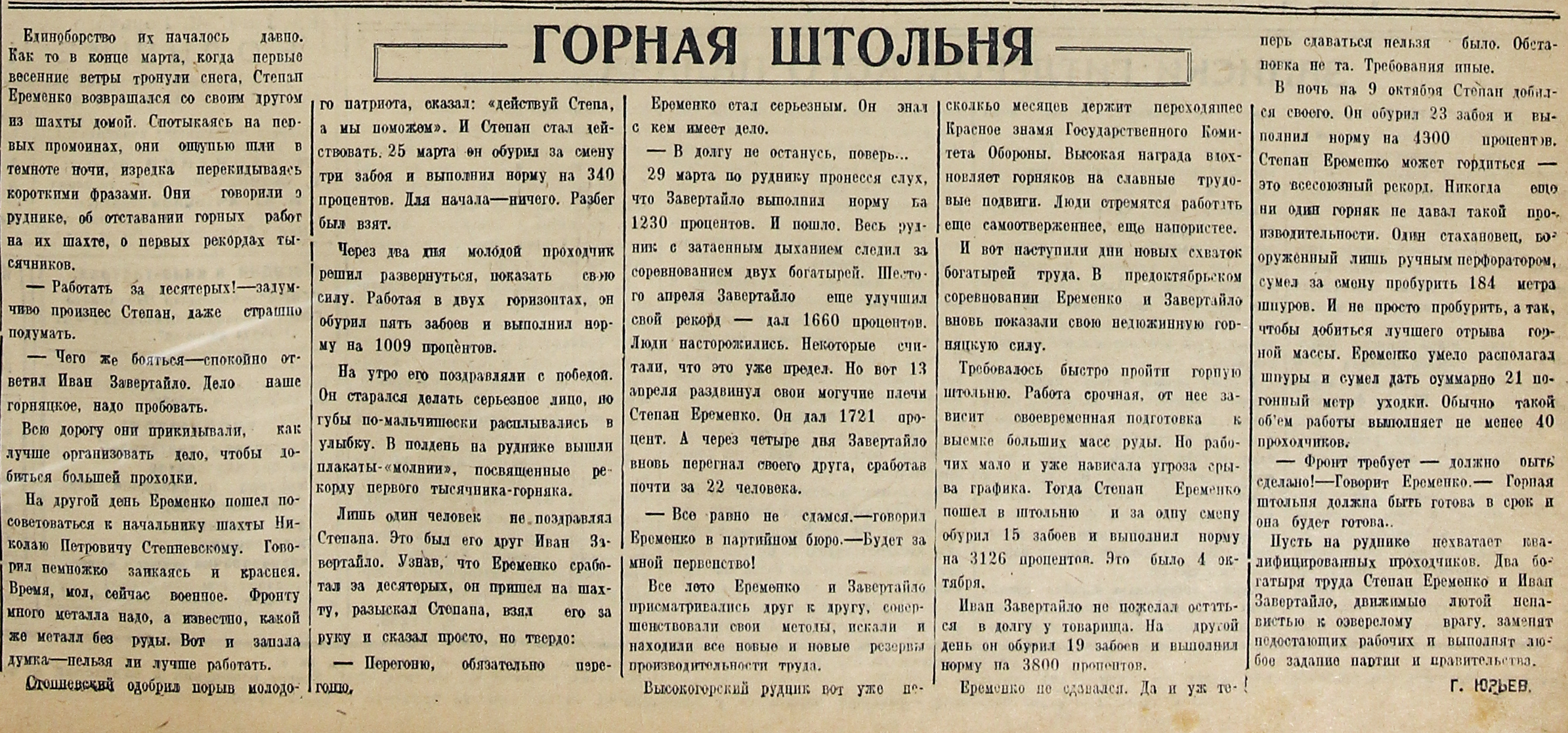 Требовалось быстро пройти горную штольню. Работа срочная, от нее зависит своевременная подготовка к выемке больших масс руды. Но рабочих мало и уже нависала угроза срыва графика. Тогда Степан Еременко пошел в штольню и за одну смену обурил 15 забоев и выполнил норму на 3126 процентов. Это было 4 октября.