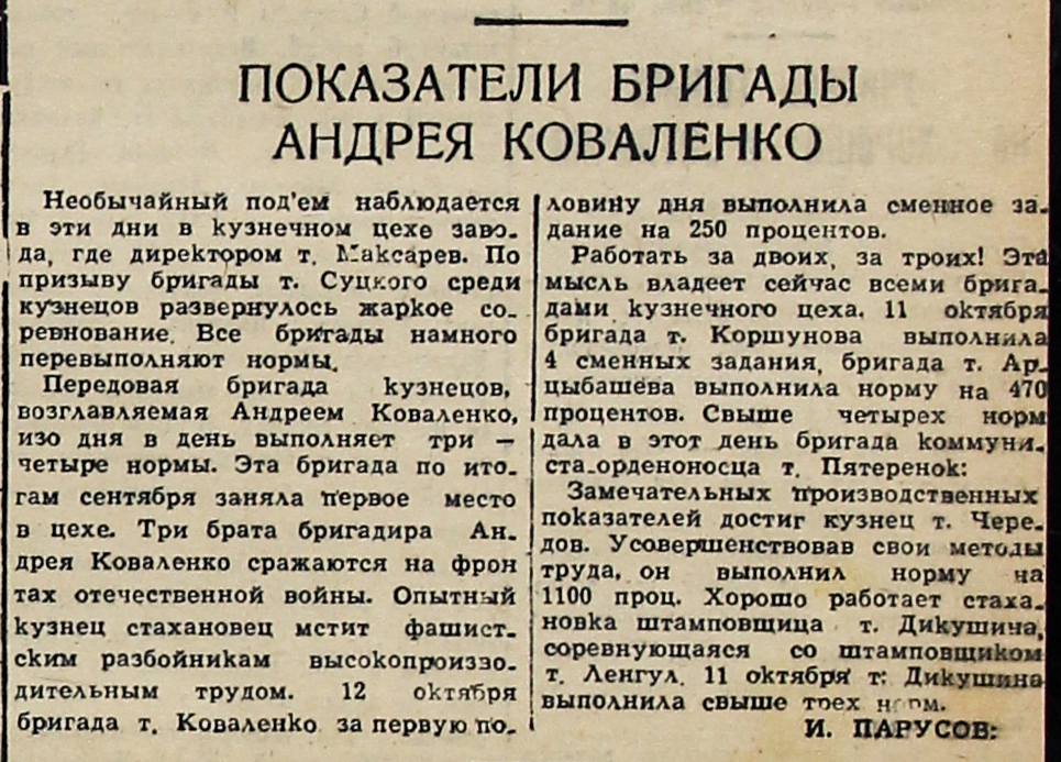 Передовая бригада кузнецов, возглавляемая Андреем Коваленко, изо дня в день выполняет три – четыре нормы. Эта бригада по итогам сентября заняла первое место в цехе. Три брата бригадира Андрея Коваленко сражаются на фронтах отечественной войны. Опытный кузнец стахановец мстит фашистским разбойникам высокопроизводительным трудом. 12 октября бригада т. Коваленко за первую половину дня выполнила сменное задание на 250 процентов.