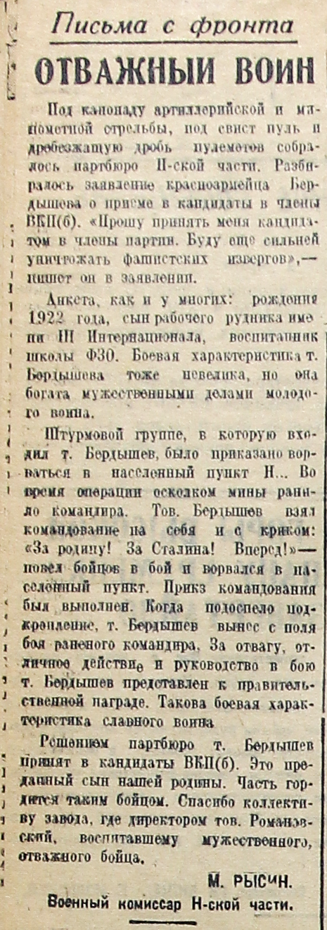 Решением партбюро т. Бердышев принят в кандидаты ВКП(б). Это преданный сын нашей родины. Часть гордится таким бойцом. Спасибо коллективу завода, где директором тов. Романовский, воспитавшему мужественного, отважного бойца.