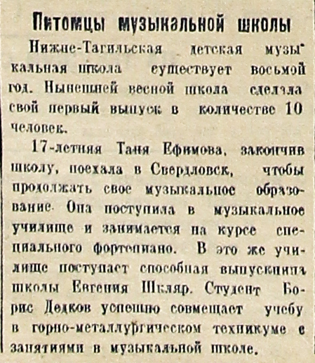 17-летняя Таня Ефимова, закончив школу, поехала в Свердловск, чтобы продолжать свое музыкальное образование. Она поступила в музыкальное училище и занимается на курсе специального фортепиано. В это же училище поступает способная выпускница школы Евгения Шкляр. Студент Борис Дедков успешно совмещает учебу в горно-металлургическом техникуме с занятиями в музыкальной школе.
