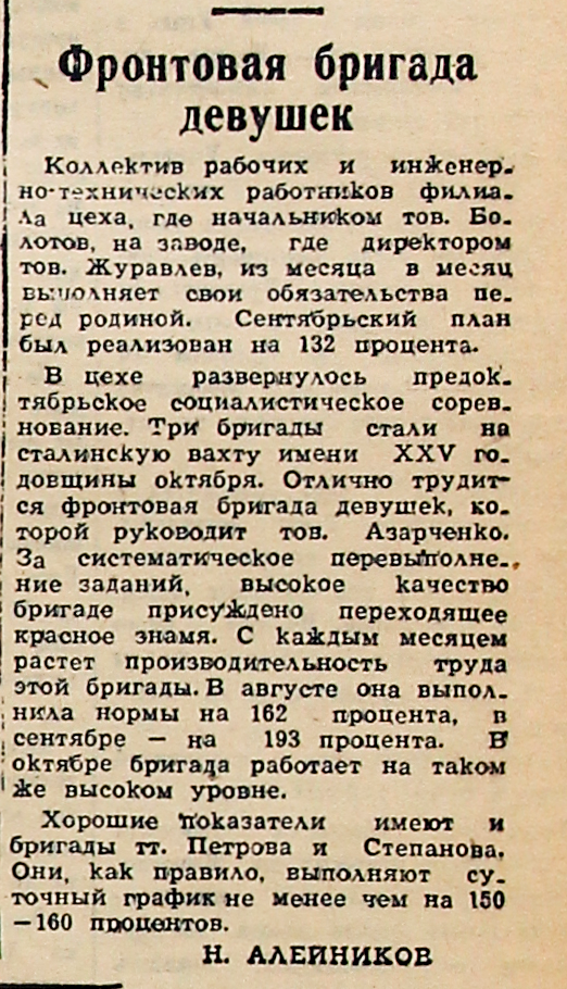 В цехе развернулось предоктябрьское социалистическое соревнование. Три бригады стали на сталинскую вахту имени XXV годовщины октября. Отлично трудится фронтовая бригада девушек, которой руководит тов. Азарченко. За систематическое перевыполнение заданий, высокое качество бригаде присуждено переходящее красное знамя. С каждым месяцем растет производительность труда этой бригады. В августе она выполнила нормы на 162 процента, в сентябре – на 193 процента. В октябре бригада работает на таком же высоком уровне.