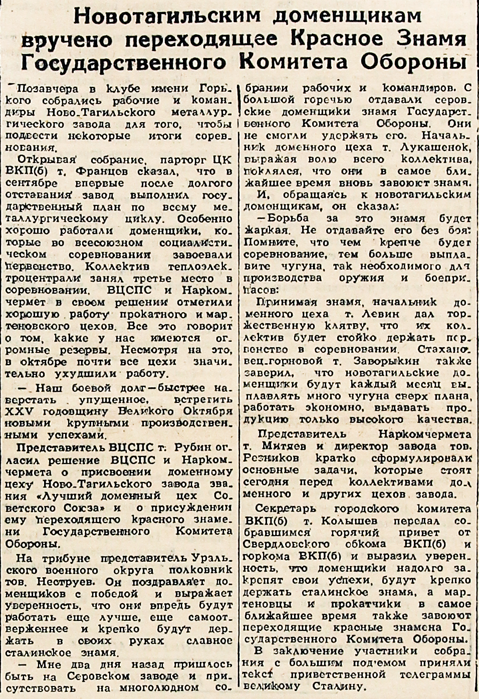 – Мне два дня назад пришлось быть на Серовском заводе и присутствовать на многолюдном собрании рабочих и командиров. С большой горечью отдавали серовские доменщики знамя Государственного Комитета Обороны. Они не смогли удержать его. Начальник доменного цеха т. Лукашенок, выражая волю всего коллектива, поклялся, что они в самое ближайшее время вновь завоюют знамя.