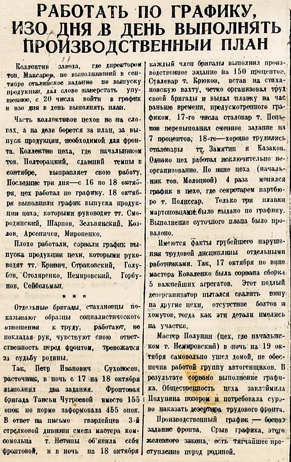 Так, Петр Иванович Сухоносов, расточник, в ночь с 17 на 18 октября выполнил два задания. Фронтовая бригада Таисьи Чугреевой вместо 155 опок по норме заформовала 455 опок. В ответ на письмо гвардейцев 3-й стрелковой дивизии смена мастера комсомольца т. Нетицы объявила себя фронтовой, и в ночь на 18 октября каждый член бригады выполнил производственное задание на 150 процентов. Сталевар т. Крюков, встав на стахановскую вахту, четко организовал труд своей бригады и выдал плавку на час раньше времени, предусмотренного графиком. 17-го числа сталевар т. Пеньков перевыполнил сменное задание на 7 процентов; 18-го – хорошо трудились сталевары Замятин и Казаков. Однако цех работал исключительно неорганизованно. По вине цеха (начальник тов. Молоцкой) 4 раза менялся график в цехе, где секретарем партбюро т. Полиссар. Только три плавки мартеновцами было выдано по графику. Выполнение суточного плана было провалено.