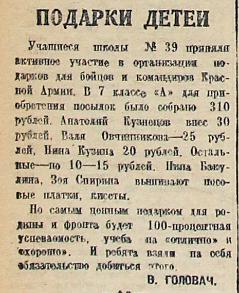 Учащиеся школы № 39 приняли активное участие в организация подарков для бойцов и командиров Красной Армии. В 7 классе «А» для приобретения посылок было собрано 310 рублей. Анатолий Кузнецов внес 30 рублей, Валя Овчинникова – 25 рублей, Нина Кузина 20 рублей. Остальные – по 10-15 рублей. Нина Бакулина, Зоя Спирина вышивают носовые платки, кисеты.