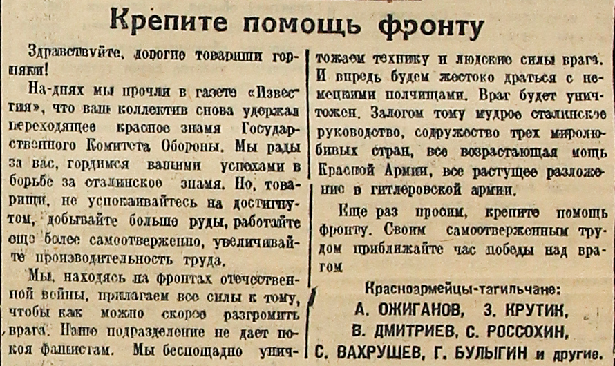 На днях мы прочли в газете «Известия», что ваш коллектив снова удержал переходящее красное знамя Государственного Комитета Обороны. Мы рады за вас, гордимся вашими успехами в борьбе за сталинское знамя. Но, товарищи, не успокаивайтесь на достигнутом, добывайте больше руды, работайте еще более самоотверженно, увеличивайте производительность труда.