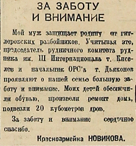 Мой муж защищает родину от гитлеровских разбойников. Учитывая это, председатель рудничного комитета рудника им. III Интернационала т. Киселев и начальник ОРСа т. Дьяконов проявляют о нашей семье большую заботу и внимание. Моих детей обеспечили обувью, произвели ремонт дома, подвезли 20 кубометров дров.