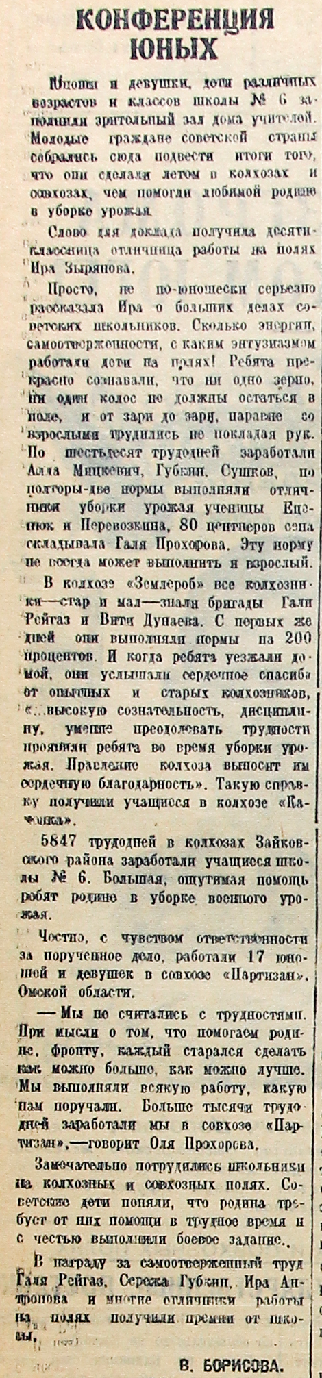– Мы не считались с трудностями. При мысли о том, что помогаем родине, фронту, каждый старался сделать как можно больше, как можно лучше. Мы выполняли всякую работу, какую нам поручали. Больше тысячи трудодней заработали мы в совхозе «Партизан», – говорит Оля Прохорова.