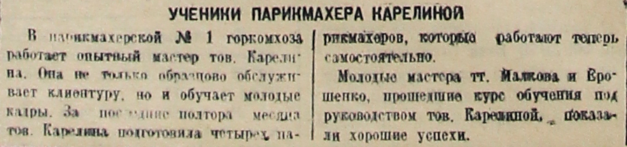 В парикмахерской № 1 горкомхоза работает опытный мастер тов. Карелина. Она не только образцово обслуживает клиентуру, но и обучает молодые кадры. За последние полтора месяца Карелина подготовила четырех парикмахеров, которые работают теперь самостоятельно.