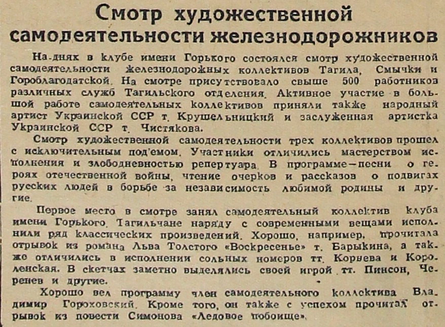 На днях в клубе имени Горького состоялся смотр художественной самодеятельности железнодорожных коллективов Тагила, Смычки и Гороблагодатской. На смотре присутствовало свыше 500 работников различных служб Тагильского отделения. Активное участие в большой работе самодеятельных коллективов приняли также народный артист Украинской ССР т. Крушельницкий и заслуженная артистка Украинской ССР т. Чистякова.