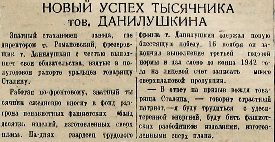 Работая по-фронтовому, знатный тысячник ежедневно вносит в фонд разгрома ненавистных фашистских банд десять изделий, изготовленных сверх плана. На днях гвардеец трудового фронта т. Данилушкин одержал новую блестящую победу. 16 ноября он закончил выполнение третьей годовой нормы и дал слово до конца 1942 года на лицевой счет записать много сверхплановой продукции.