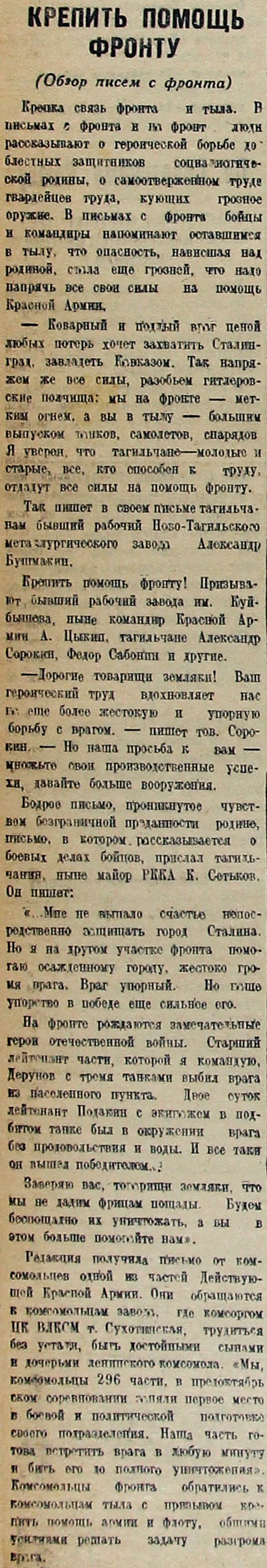 Крепить помощь фронту! Призывают бывший рабочий завода им. Куйбышева, ныне командир Красной Армии А. Цыкин, тагильчане Александр Сорокин, Федор Сабонин и другие.