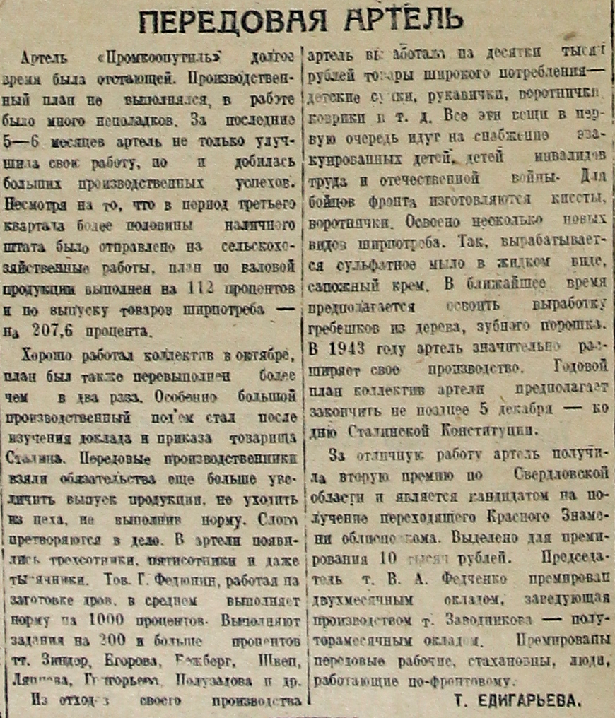 Из отходов своего производства артель выработала на десятки тысяч рублей товары широкого потребления – детские сумки, рукавички, воротнички, коврики т. д. Все эти вещи в первую очередь идут на снабжение эвакуированных детей, детей инвалидов труда и отечественной войны. Для бойцов фронта изготовляются кисеты, воротнички. Освоено несколько новых видов ширпотреба. Так, вырабатывается сульфатное мыло в жидком виде, сапожный крем. В ближайшее время предполагается освоить выработку гребешков из дерева, зубного порошка. B 1943 году артель значительно расширяет свое производство. Годовой план коллектив артели предполагает закончить не позднее 5 декабря – ко дню Сталинской Конституции.