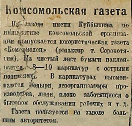 На заводе имени Куйбышева по инициативе комсомольской организации выпускается юмористическая газета «Комсомолец» (редактор т. Сорокотягин). На чистый лист бумаги наклеивается 8-10 карикатур с острыми подписями. В карикатурах высмеиваются лодыри, дезорганизаторы производства, люди, плохо заботящиеся о бытовом обслуживании рабочих и т. д.
