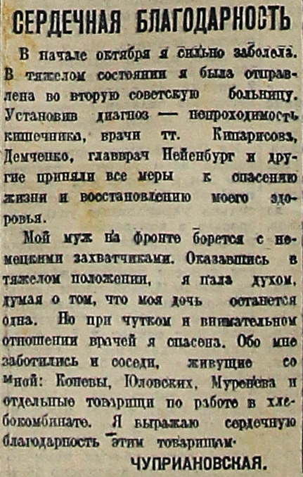 Мой муж на фронте борется с немецкими захватчикам. Оказавшись в тяжелом положении, я пала духом, думая о том, что моя дочь останется одна. Но при чутком и внимательном отношении врачей я спасена. Обо мне заботились и соседи, живущие со мной: Коневы, Юловских, Муренева и отдельные товарищи по работе в хлебокомбинате. Я выражаю сердечную благодарность этим товарищам.